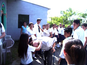 Begrüsst wurden wir mit einem Spalier von Kindern und Jugendlichen, die jedem Besucher (in den Bildern Helmut Köhler) ein selbst gemaltes Holzkreuz umhängten und eine Papiertaube überreichten...
