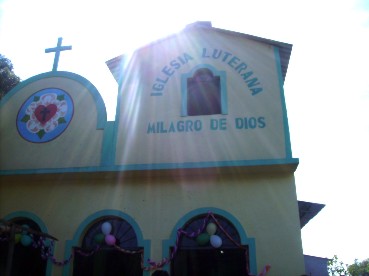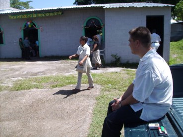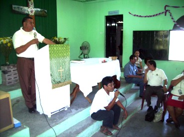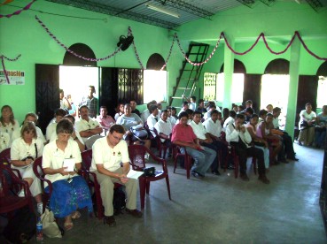 Der Tag in Guaycume begann dann mit einem gemeinsamen Gottesdienst, an dem die meisten Pfarrerinnen und Pfarrer der Microregion Norte beteiligt waren. Im Bild rechts sitzend: der Dolmetscher, der für die Englisch sprechenden Besucher simultan übersetzte. (für die Deutschen mussten Helmut und ich herhalten...)