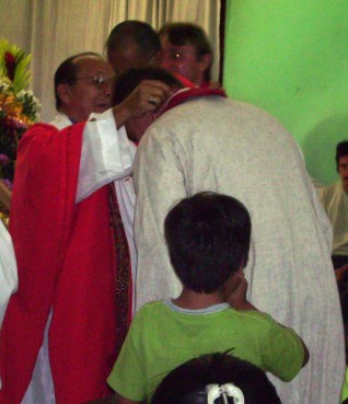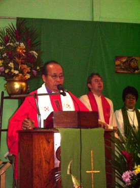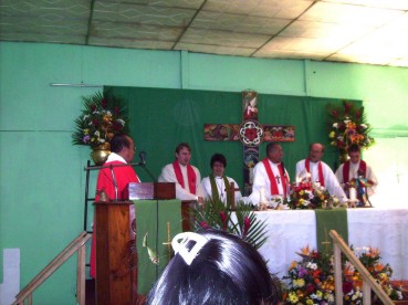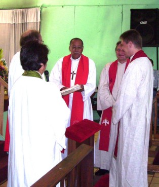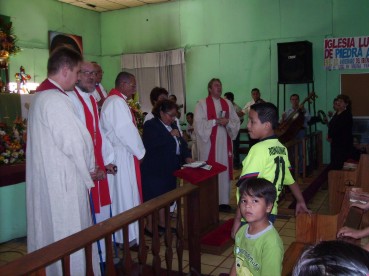 Am Sonntag vor dem Reformationsfest, am 29.10.2006, wurde ich in der Resurriccion als Pfarrer der Lutherischen Kirche El Salvador installiert. Mir war der Termin eigentlich nicht sehr recht, kam ich doch erst am Samstag Abend von einer anstrengenden Woche aus Antigua zurück, aber der Bischof wollte die Installation unbedingt an diesem Termin. (siehe auch die Seite zur Reformation) Nach meiner Ordination im Juli und der Verabschiedung aus Karlstadt im September, war dies nun der dritte Gottesdienst innerhalb weniger Wochen, in dem mir unter Handauflegung Gottes Segen zugesprochen wurde. Es war ein sehr schöner Gottesdienst - ich habe auch fast alles verstanden - die Kirche war gut besucht und, was mich besonders gefreut hat, alle Leute aus meinem derzeitigem Umfeld, Waltraud und Helmut (sie haben sogar extra den Gottesdienst in Las Minas auf den Nachmittag verschoben), Hannah und David, (die Voluntarios) und Berta und Matthias (die Studenten)...