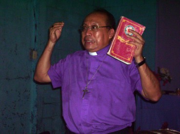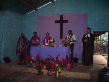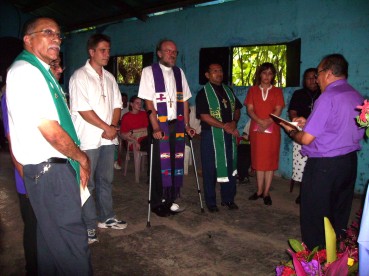 Links die Kirche “pan de vida” (Brot des Lebens) in Jayaque. Hier fand die Trauerfeier für Jesus und Francisco statt. Nach den Morden wurde eine Kommission gebildet, die sich vorerst um die Gemeinden kümmern soll. Zu dieser Gruppe gehören auch Diakon Köhler und ich. Bischof Gomez hielt es für sehr wichtig, dass auch wir Deutschen dabei sind. Das sei nochmal ein ganz besonders Zeichen für die Menschen hier, dass sich auch Menschen aus einem anderen Teil der Welt um sie kümmern. Aufgabe dieser Kommission ist Momentan der Versuch, das Gottesdienst- und Gemeindeleben aufrecht zu erhalten, die verzweifelte und verängstigte Gemeinde seelsorgerlich zu betreuen und gemeinsamen mit den Menschen Trauerarbeit zu leisten. Im Bild Rechts ein Teil dieser Kommission bei der Vorstellung in Jayaque.