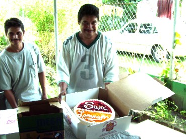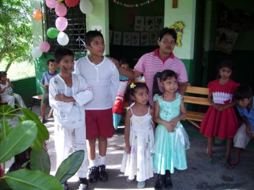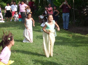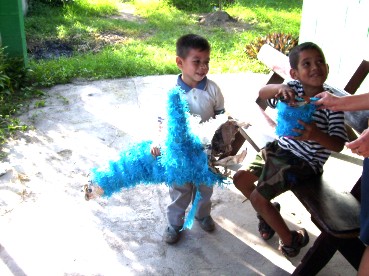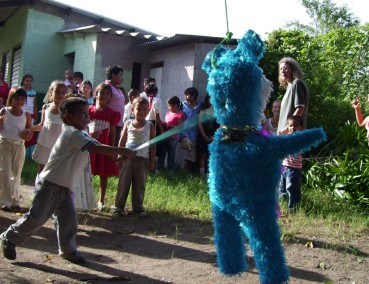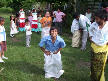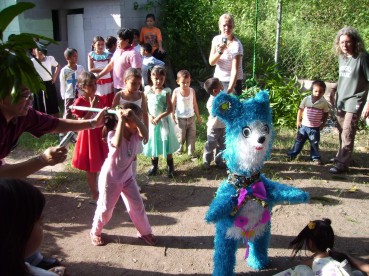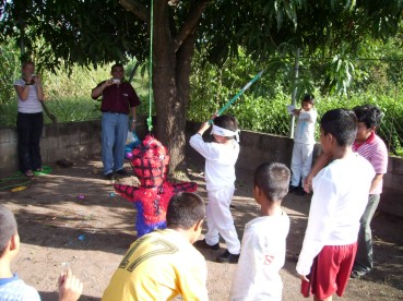 ...und dann wurde richtig getobt. Sackhüpfen und Eierlauf und dann, der Höhepunkt, die Pinjata. (Fotos unten) Hierbei handelt es sich um eine Puppe, die mit Süßigkeiten gefüllt ist. Die Puppe wird an einer Schnur nach oben gezogen und ein Kind versucht sie mit einem Holzstock zu erwischen. Immer wenn Süßigkeiten herunter fallen, stürzen alle in die Mitte und versuchen möglichst viel davon zu erwischen...