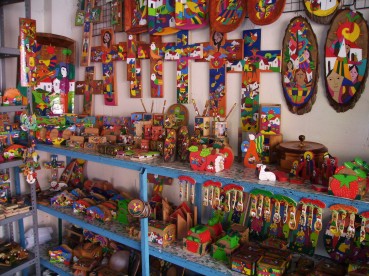 Oben: zwei von unzähligen tiendas para artesania (Kunsthandwerkläden), Unten: zwei Krippen im typischen Stil, Lebensgroß...