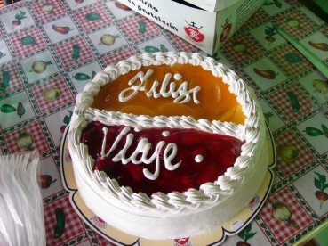 Am 15. August stand mein letzter (offizieller) Gang in die Casa Concordia, das “Landeskirchenamt” an. Die komplette Belegschaft, eine ganze Reihe von Kindern und einige Pfarrerinen und Pfarrer hatten sich am Nachmittag dort eingefunden, - und dafür, dass in dieser Woche gerade Ferien waren, waren es richtig viele - um mich zu verabschieden. Es war kein leichter Gang, bin ich hier doch im vergangenen Jahr fast täglich ein und aus gegangen. Aber es war schön, wie viele gekommen sind, für mich schon auch ein deutliches Zeichen, dass meine Zeit in El Salvador nicht unfruchtbar war. Die Casa Concordia war reich und bunt geschmückt, es gab die obligatorische Torte (mit der Aufschrift “gute Reise”) Cola und Fanta bis zum Abwinken und auch ein paar Tränen. Der Bischof begann die “Abschiedsfeier” mit einer Andacht und nach seinen und meinen Abschiedsworten war das Buffet dann eröffnet.